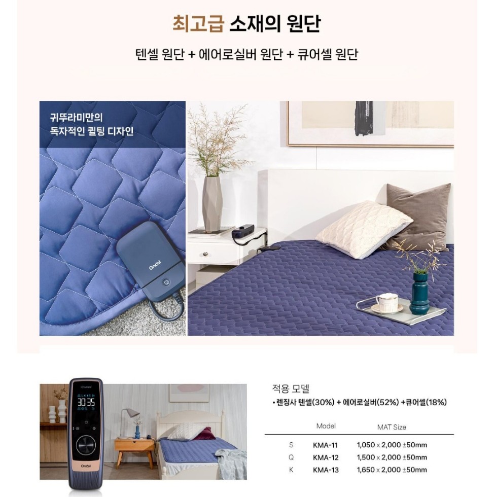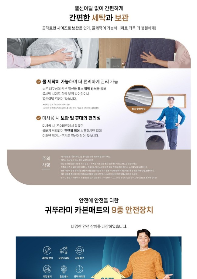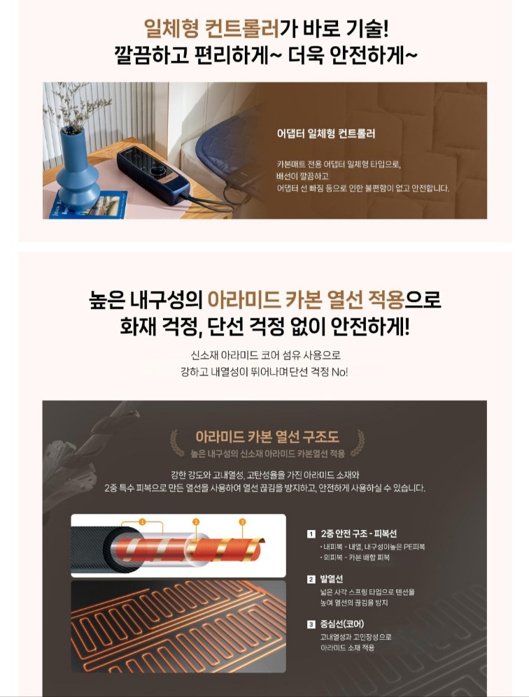 높은 내구성을 자랑하는 아라미드 카본 열선적용으로 화재걱정, 누수걱정없이 세탁까지 가능